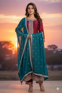 Maroon Embroidered Anarkali Suit Set with Teal Dupatta