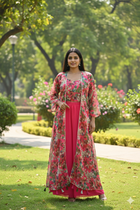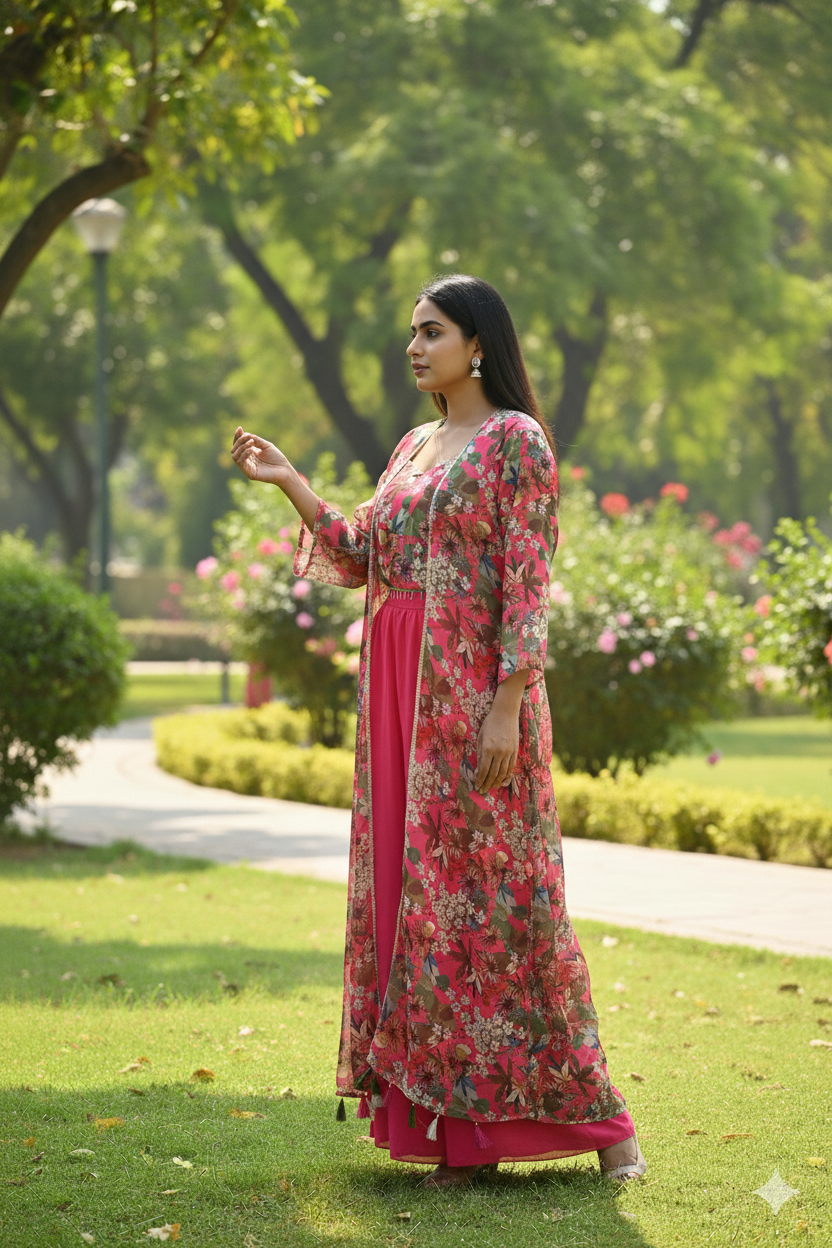 Pink Floral Print Crop Top with Palazzo and Long Jacket Set