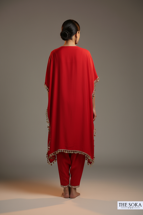 Natural Crepe Red Kaftan Style Kurta Set with Dhoti Pants
