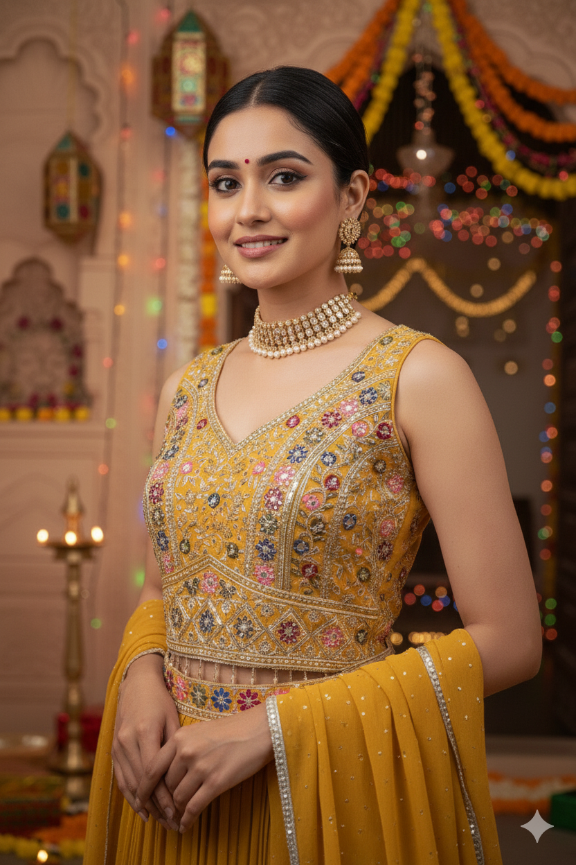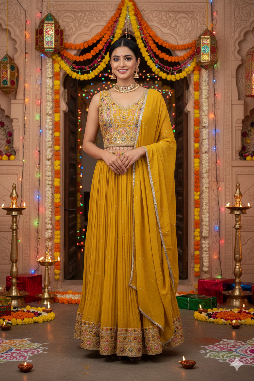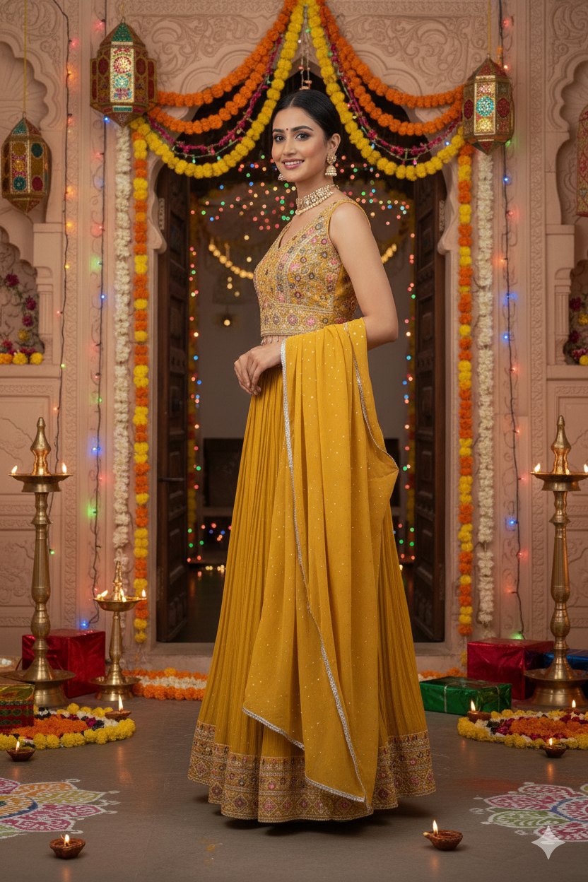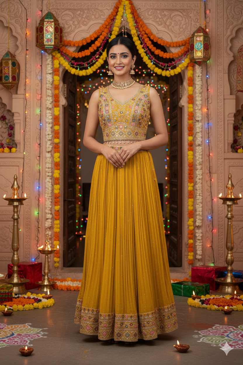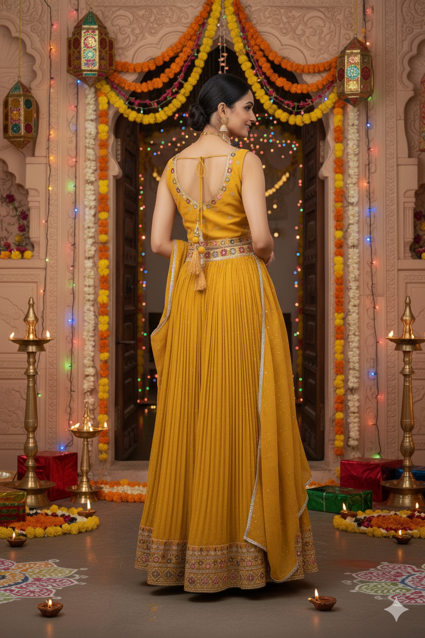 Mustard Yellow Embroidered Sleeveless Lehenga Choli with Dupatta