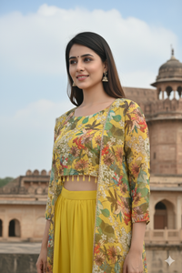 Yellow Floral Print Crop Top and Palazzo Set with Long Shrug
