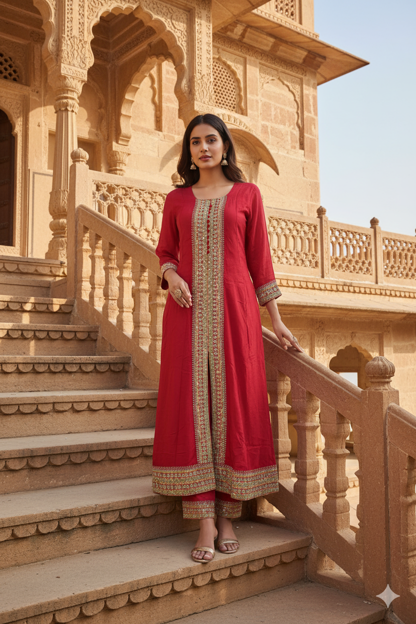 Crimson Red Anarkali Kurta Set with Printed Dupatta Set