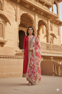 Crimson Red Anarkali Kurta Set with Printed Dupatta Set - M