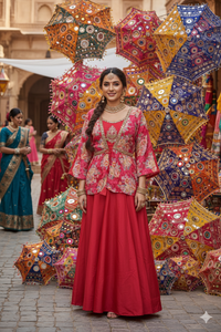 Red Floral Printed Peplum Jacket with Crop Top and Flared Palazzo Set