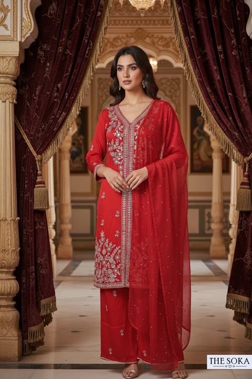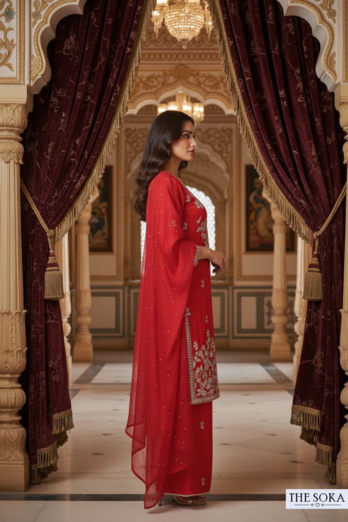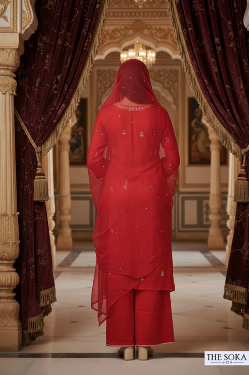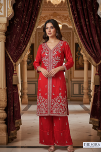Pure Chinon Red Embroidered Kurta Set with Handmade Detailing