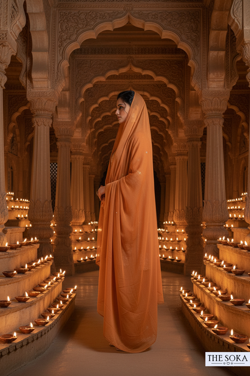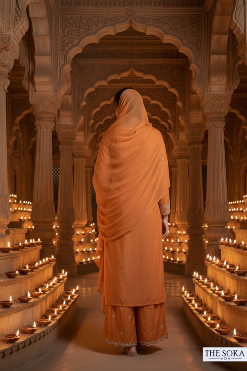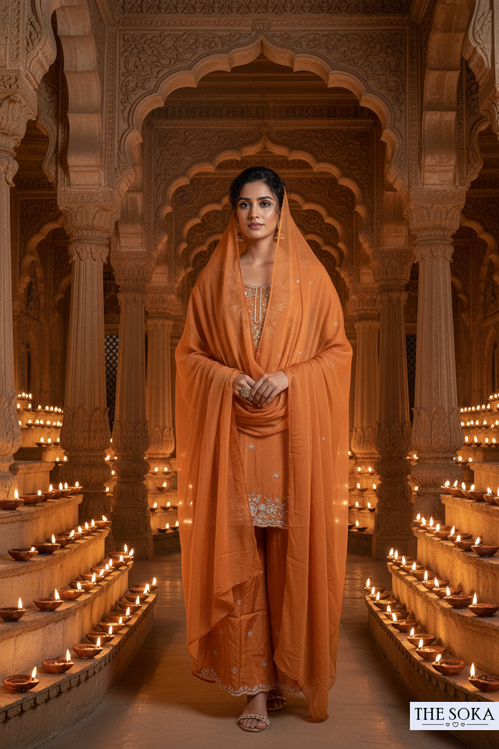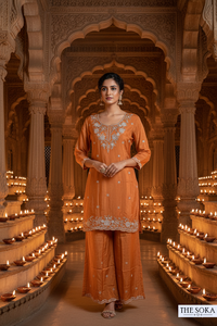 Pure Chinon Rust Orange Embroidered Silk Kurta with Sharara Set