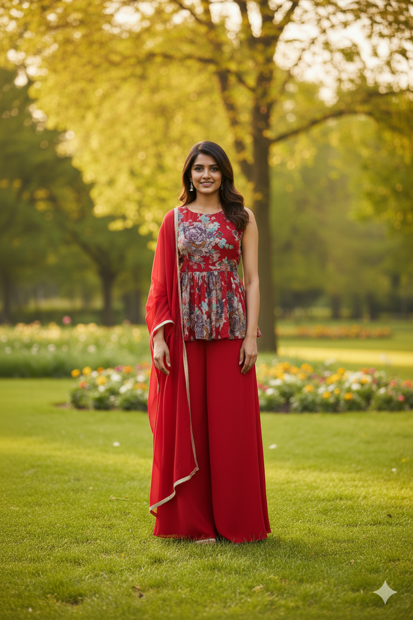 Red Floral Peplum Top with Palazzo and Dupatta Set