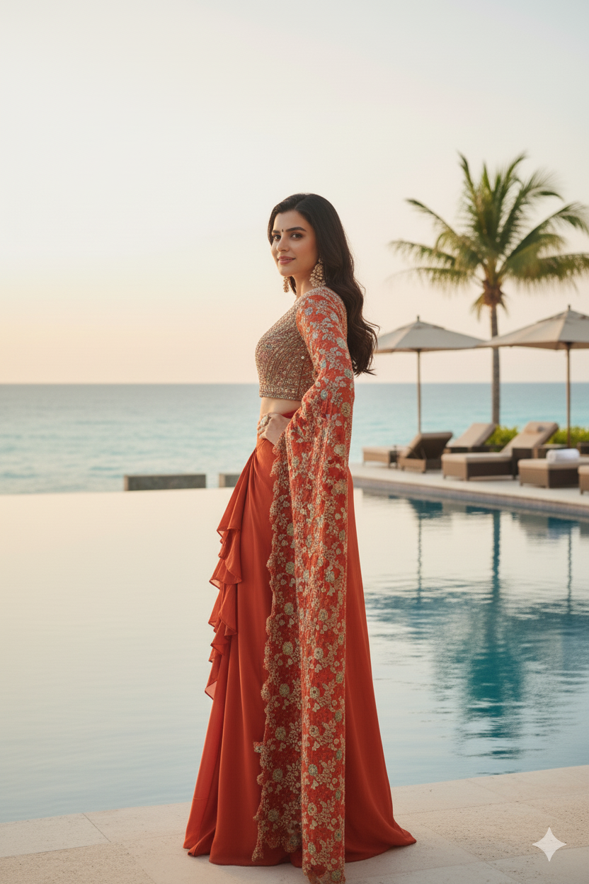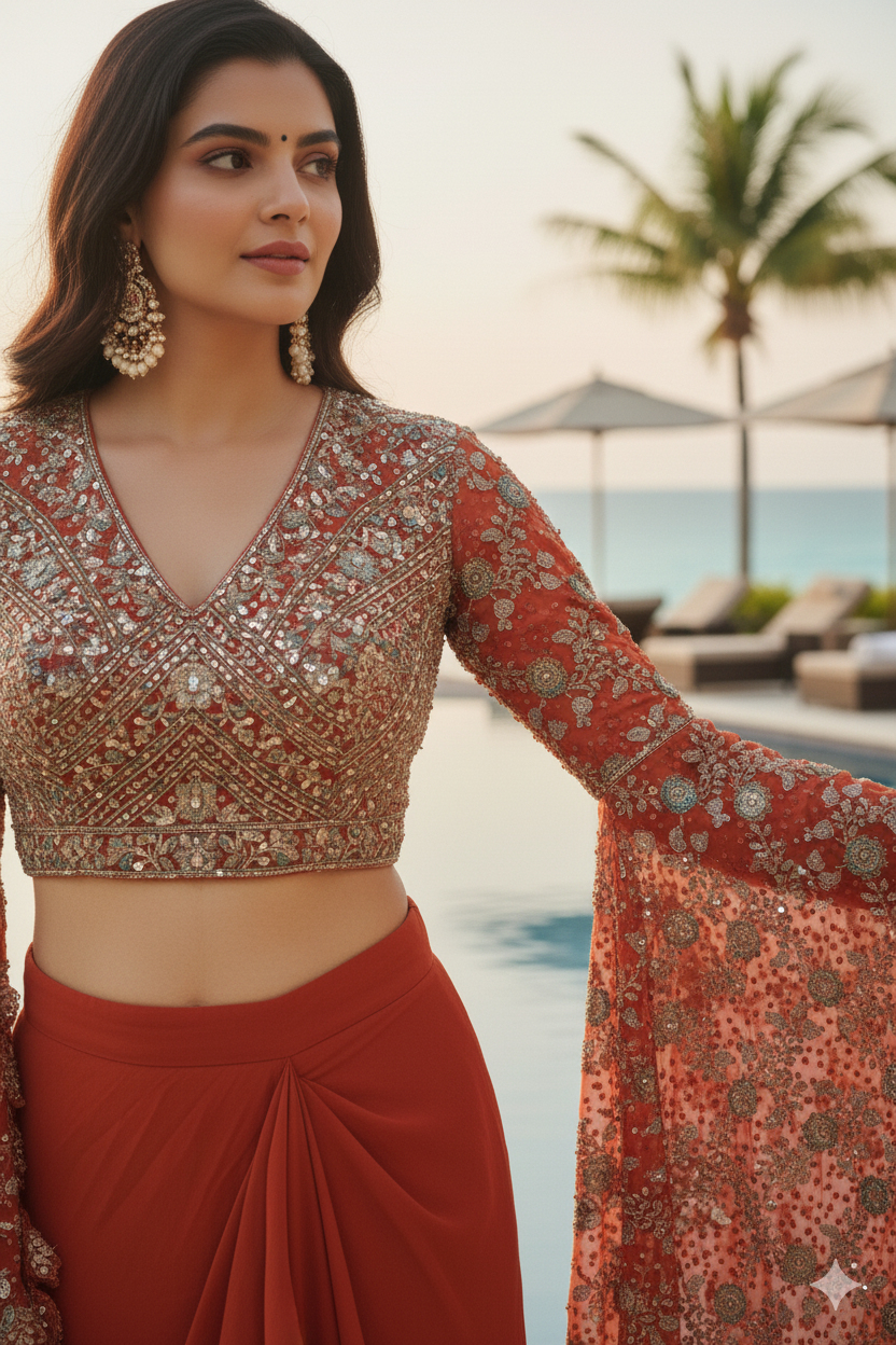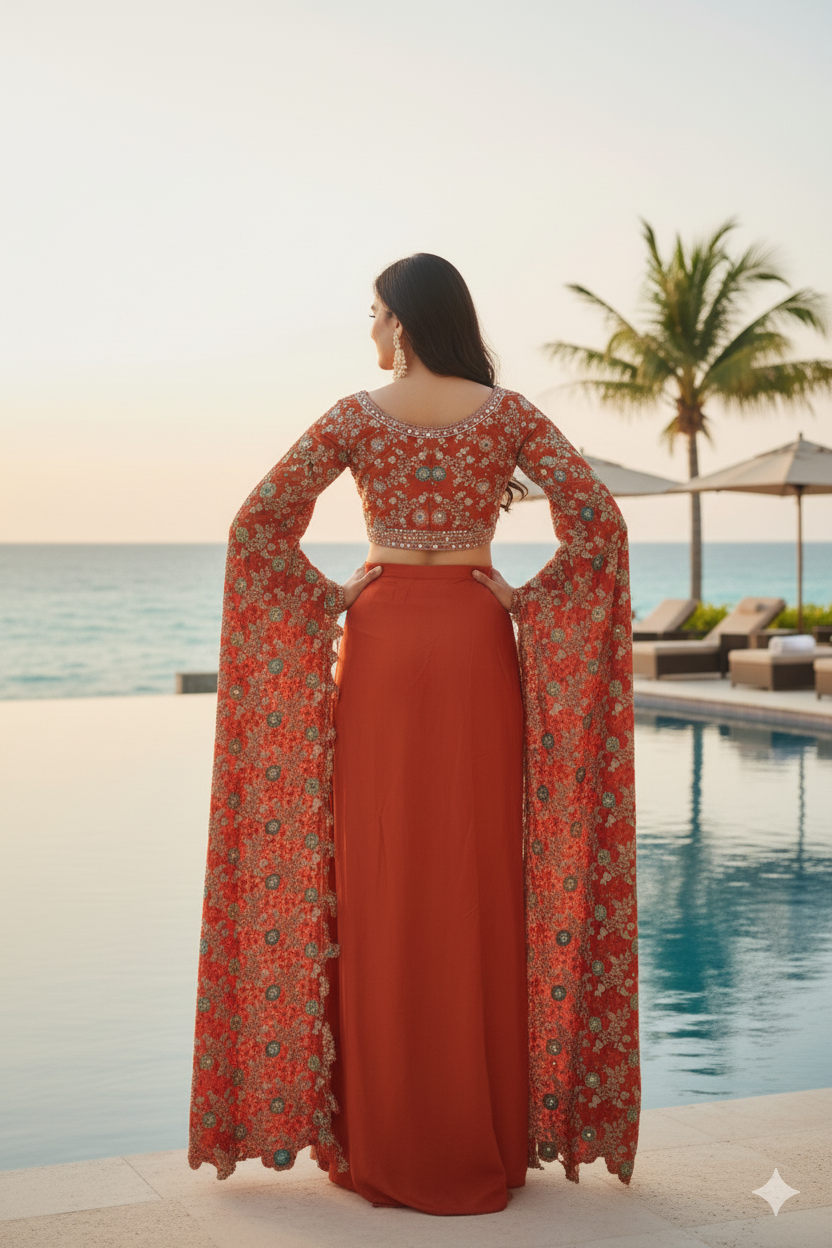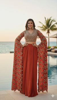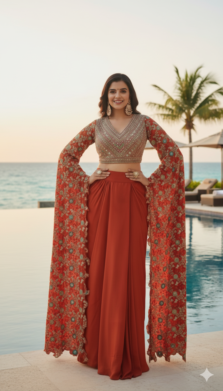 Rust Orange Embroidered Long-Sleeve Crop Top and Dhoti Skirt