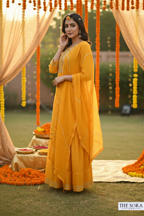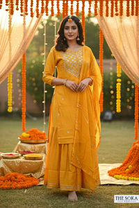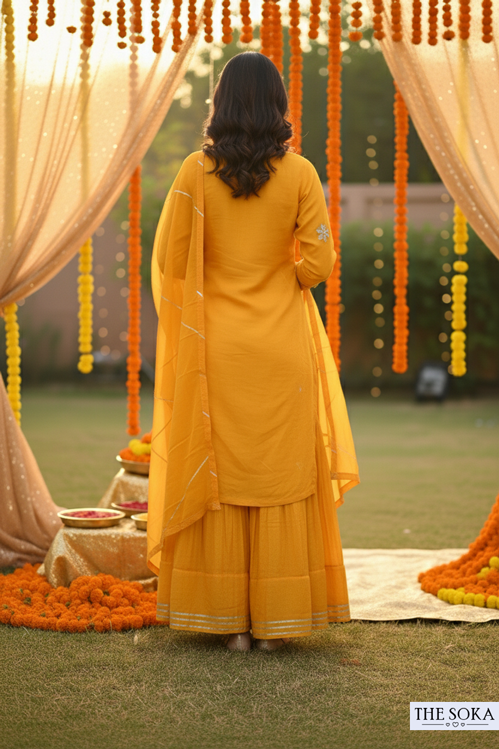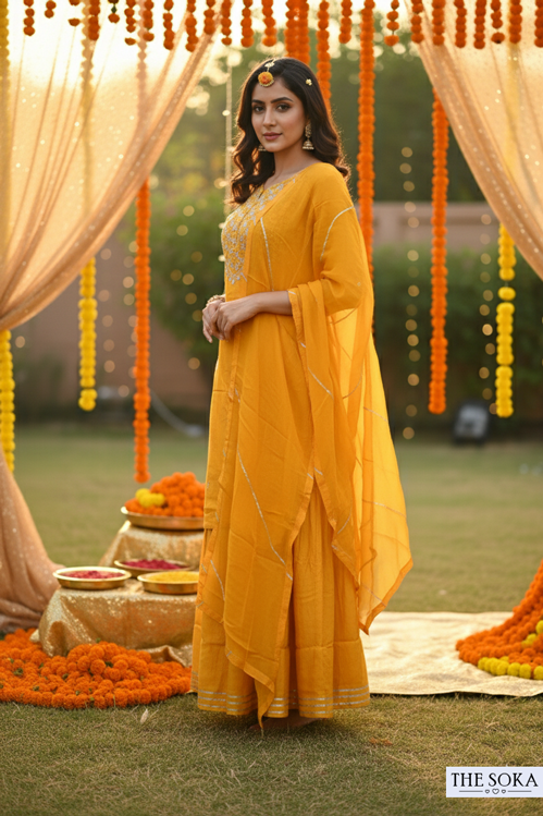 Pure Dola Silk Mustard Yellow Embroidered Kurta with Palazzo and Dupatta Set