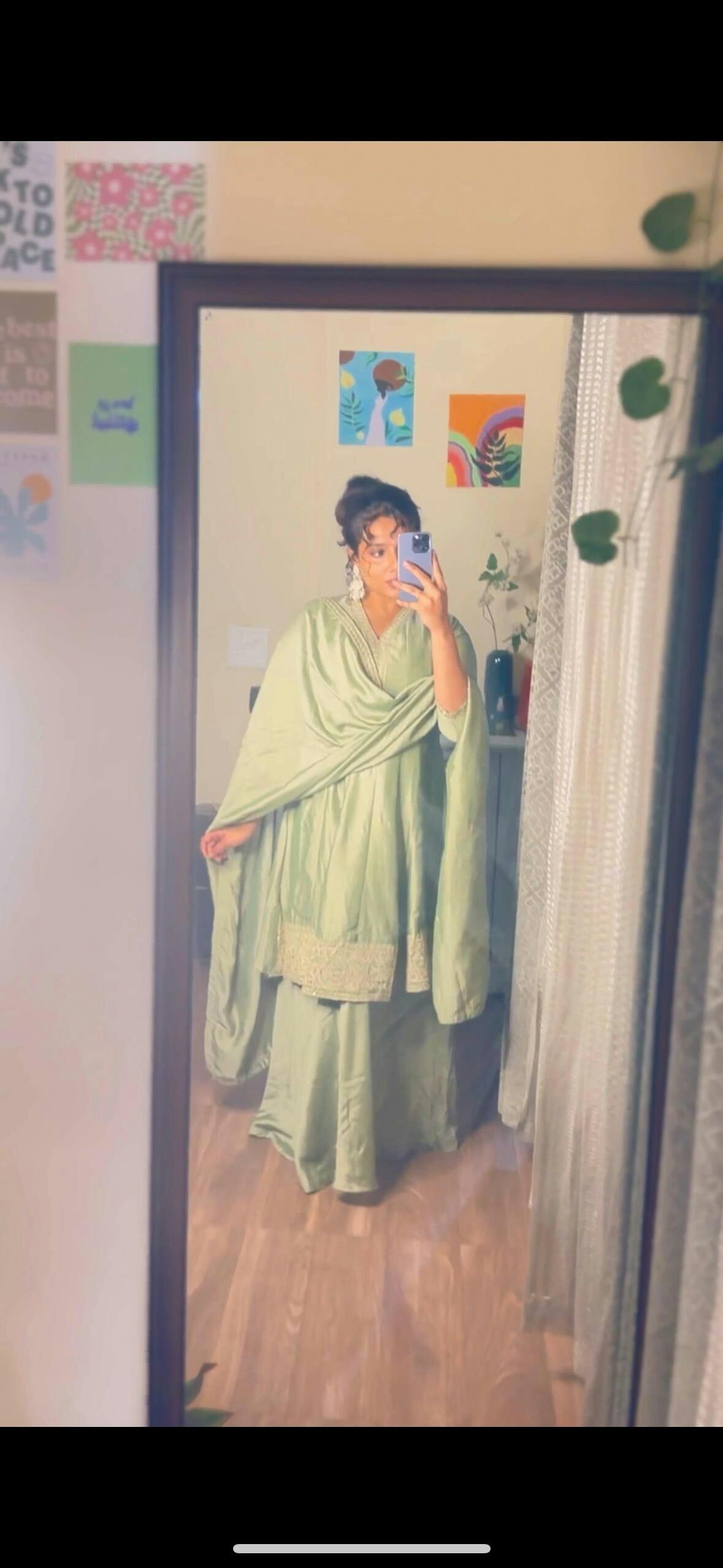 Premium Silk Sage Green Embroidered Kurta Set with Palazzo Pants - M