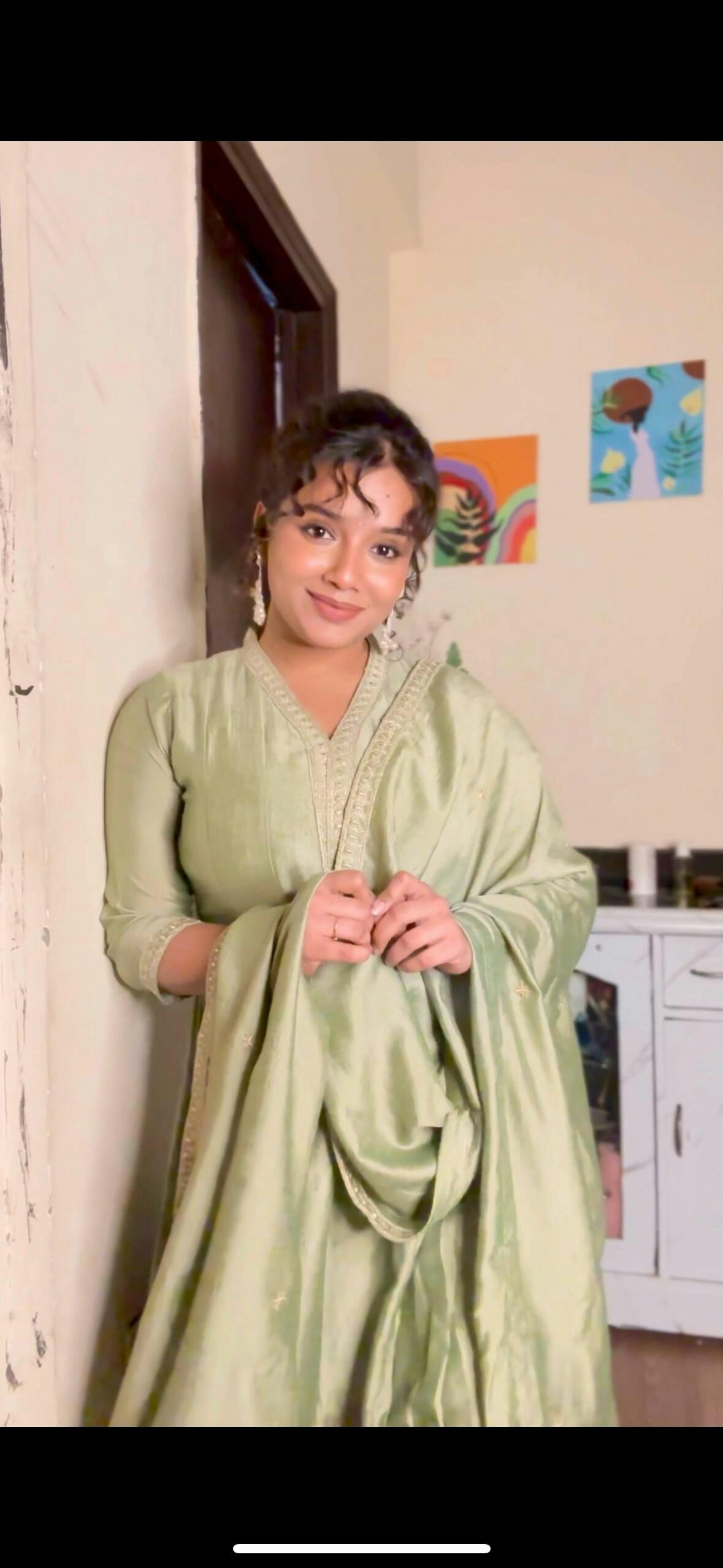 Premium Silk Sage Green Embroidered Kurta Set with Palazzo Pants