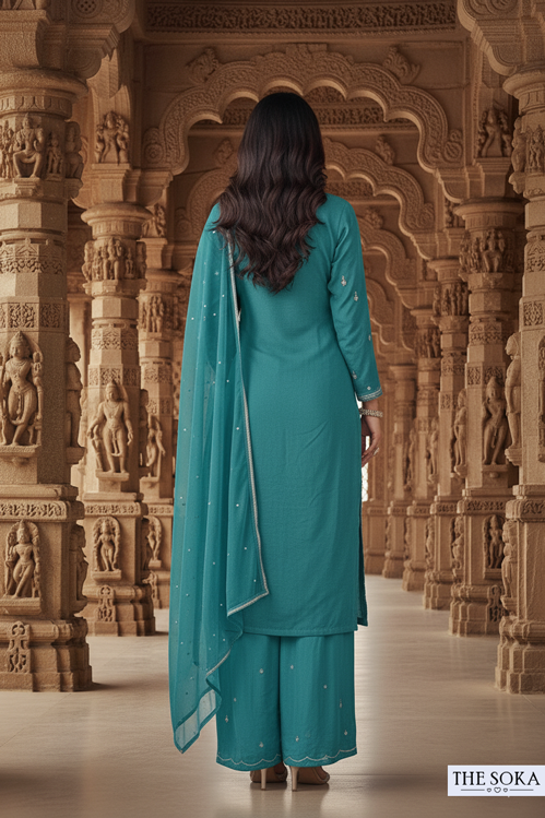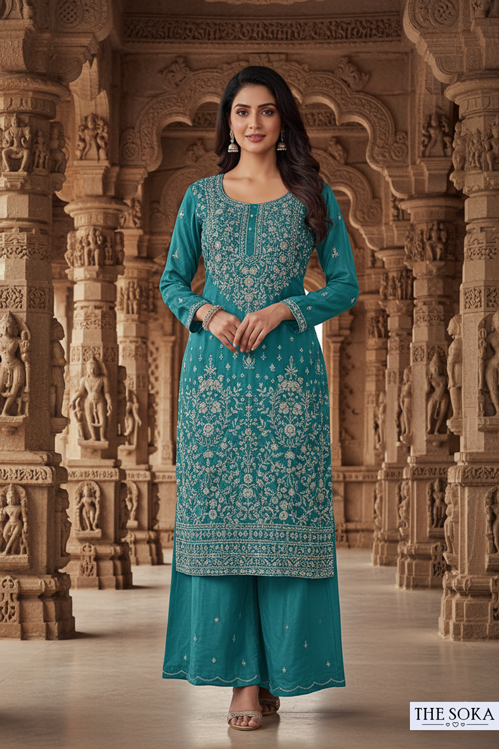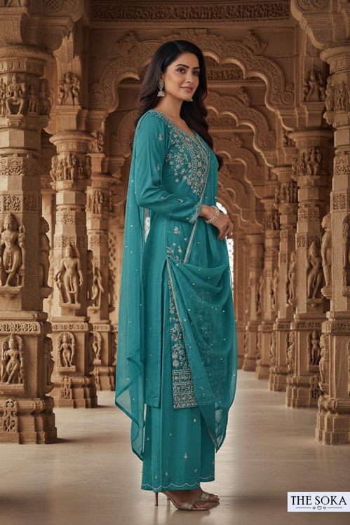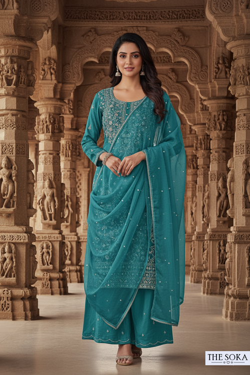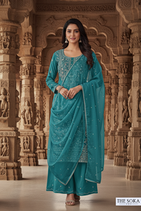 Pure Chinon Teal Blue Embroidered Palazzo Suit with Dupatta