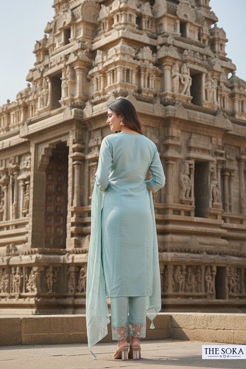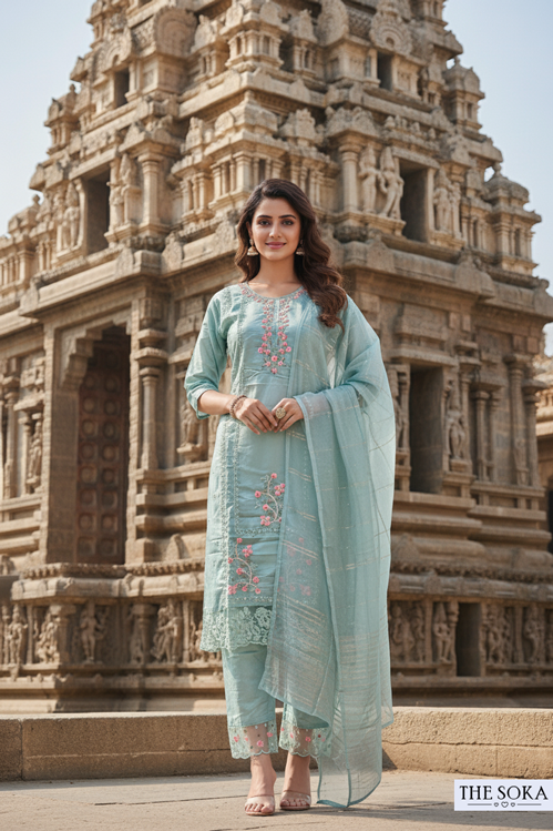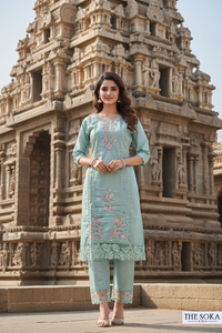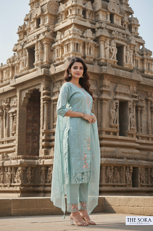 Mint Green Embroidered Kurta Set with Lace Detailing and Dupatta