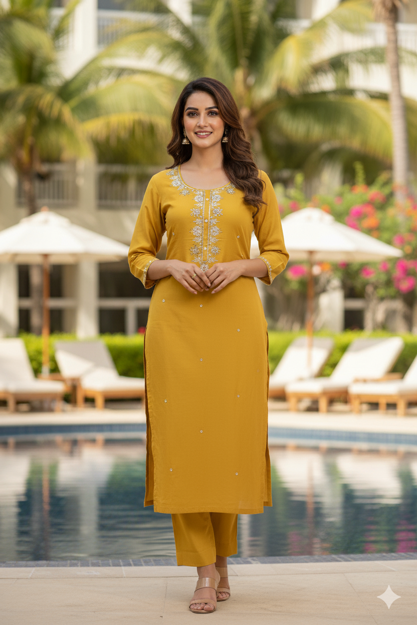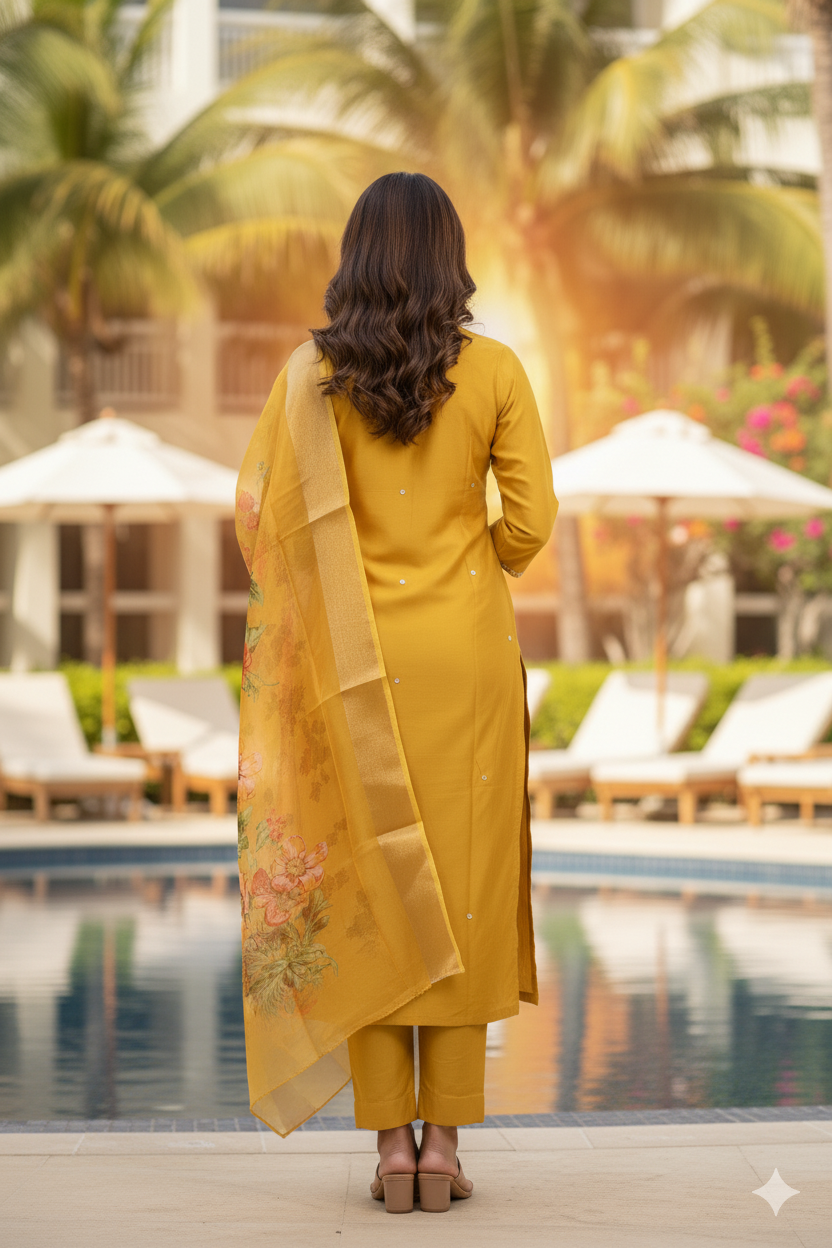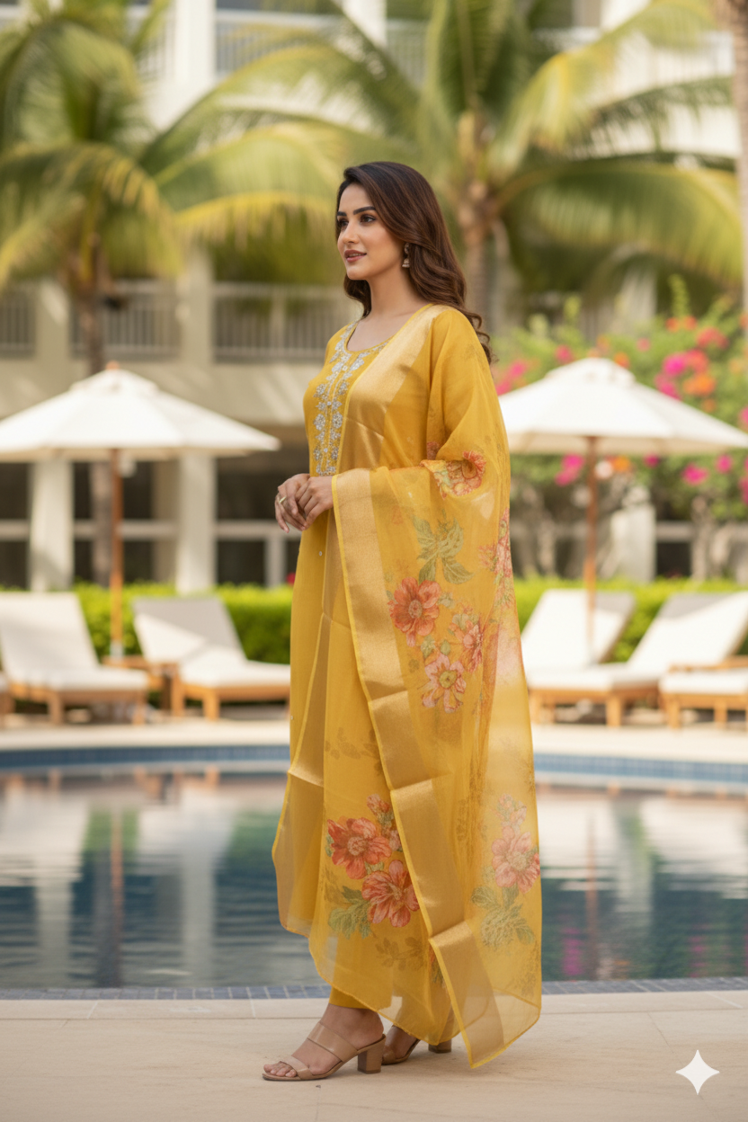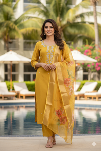 Mustard Yellow Embroidered Straight Kurta Set with Floral Dupatta