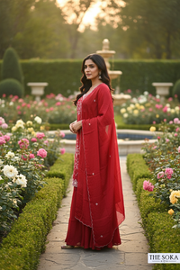 Pure Dola Silk Embroidered Peplum Kurta Set with Red Sharara Pants and Dupatta - M