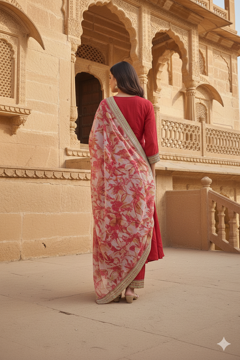 Crimson Red Anarkali Kurta Set with Printed Dupatta Set