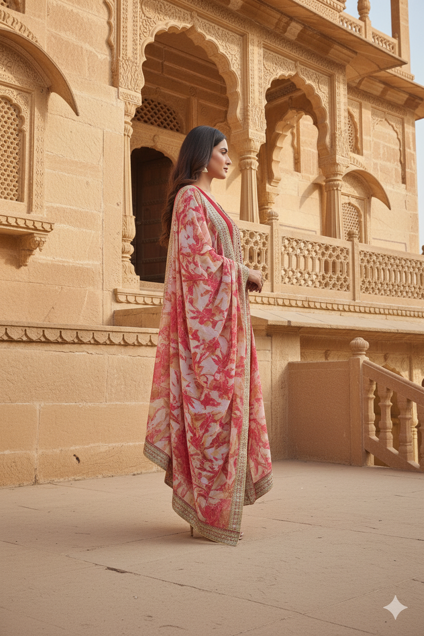 Crimson Red Anarkali Kurta Set with Printed Dupatta Set - M