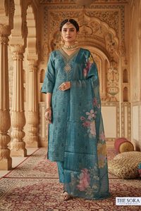 Teal Blue Embroidered Kurta Set with Floral Dupatta and Pant - M