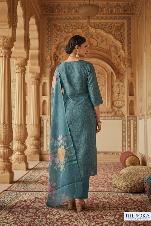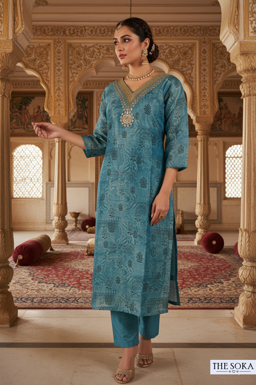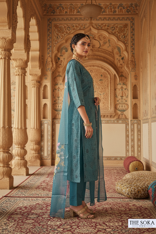 Teal Blue Embroidered Kurta Set with Floral Dupatta and Pant
