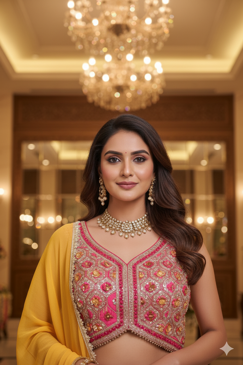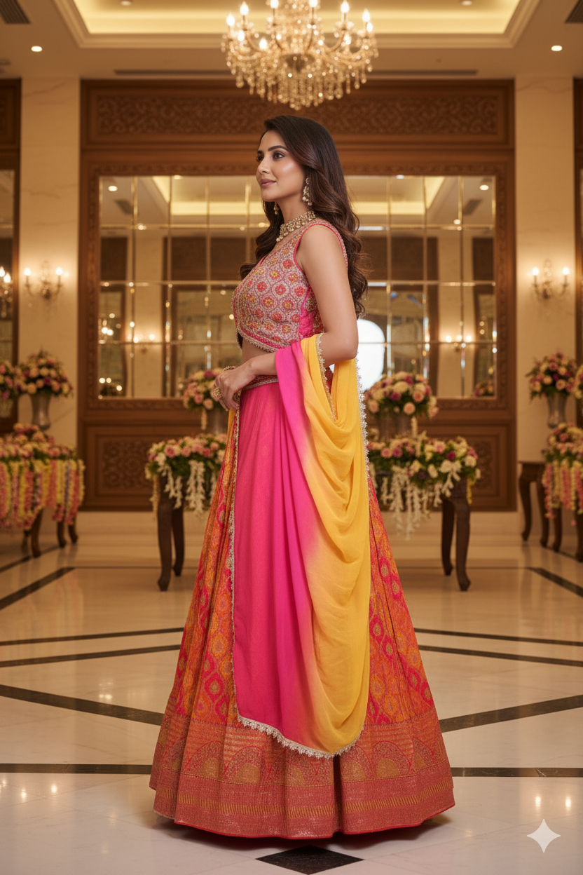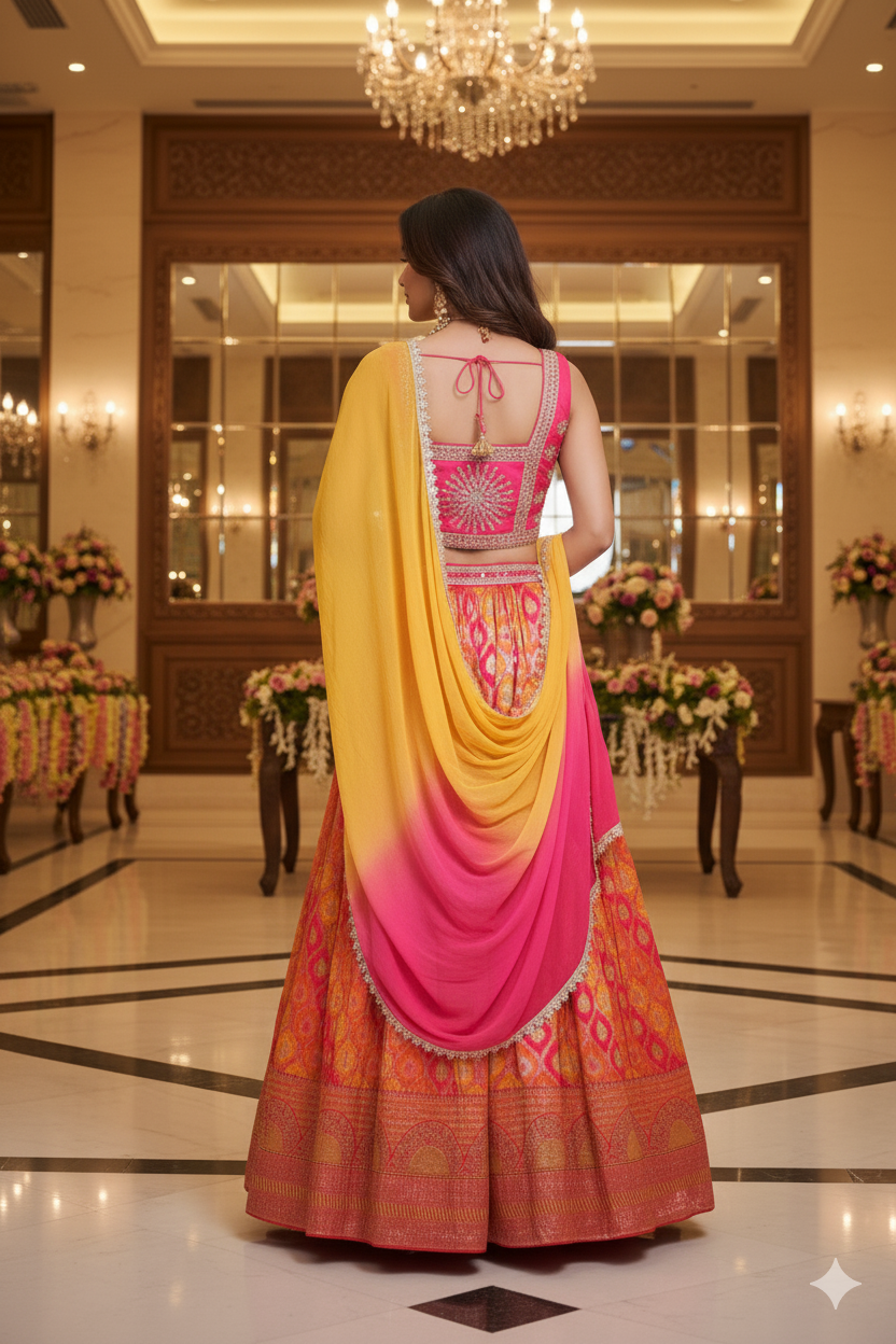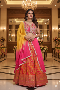 Pink & Orange Embroidered Banarasi Lehenga Choli with Yellow-Pink Ombre Dupatta