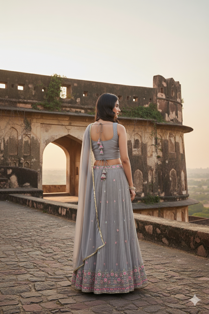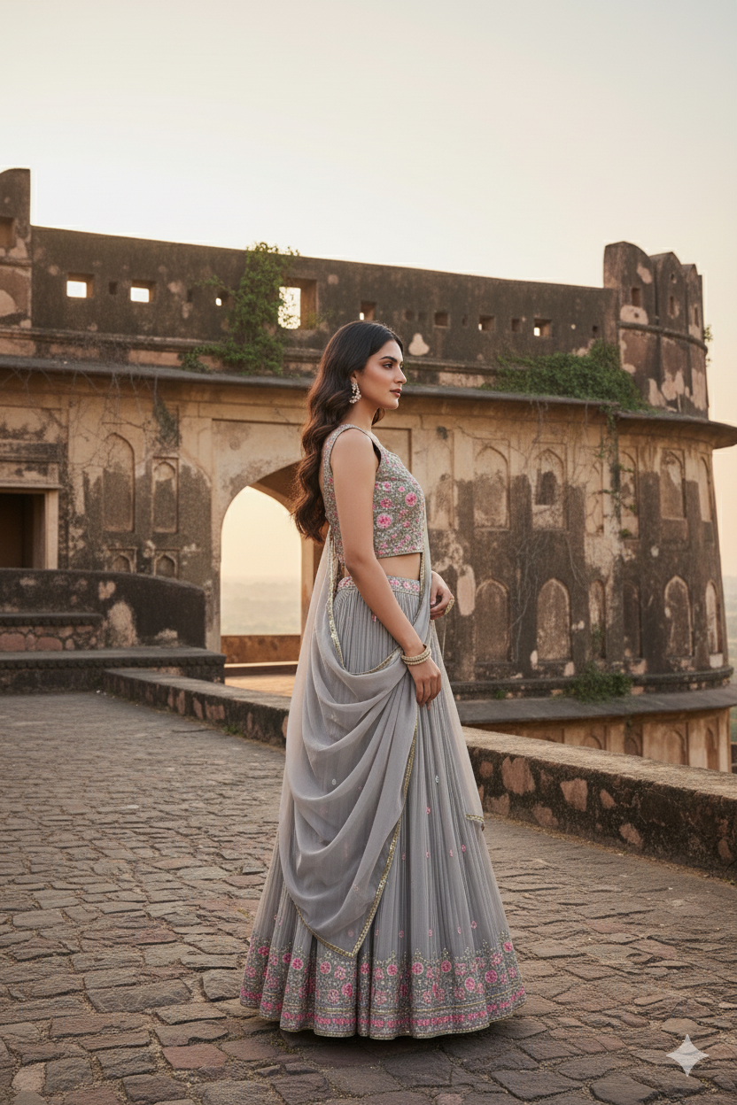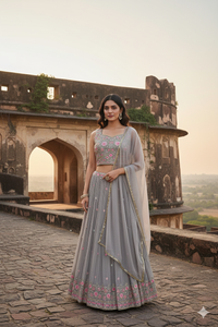 Grey Embroidered Lehenga Choli with Dupatta - M