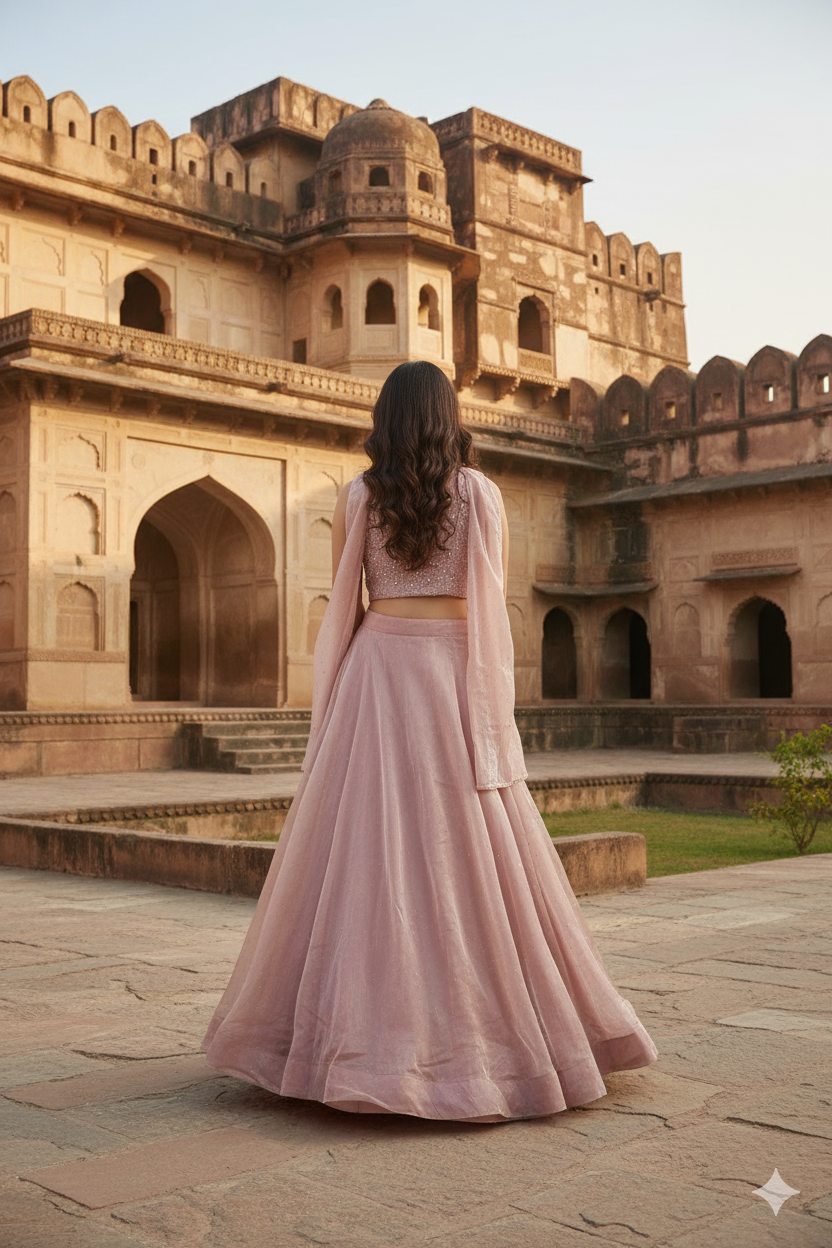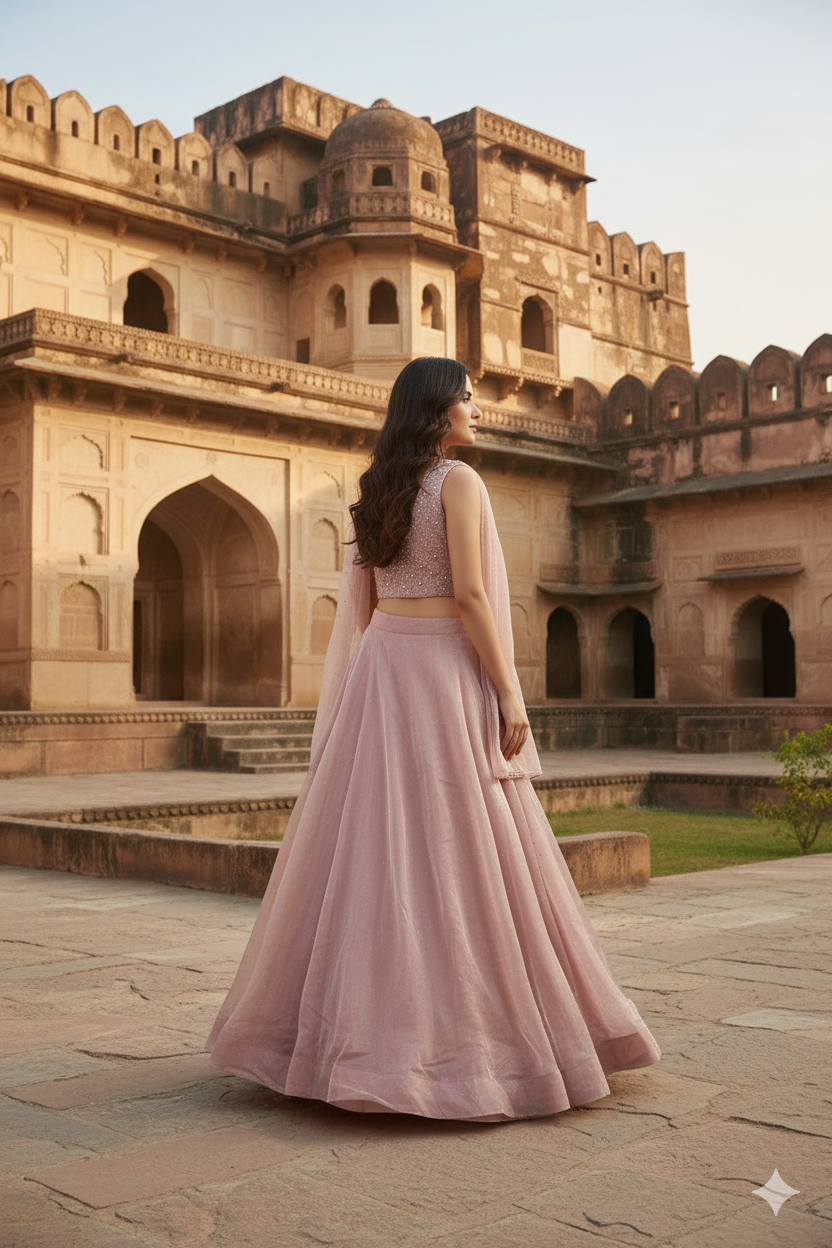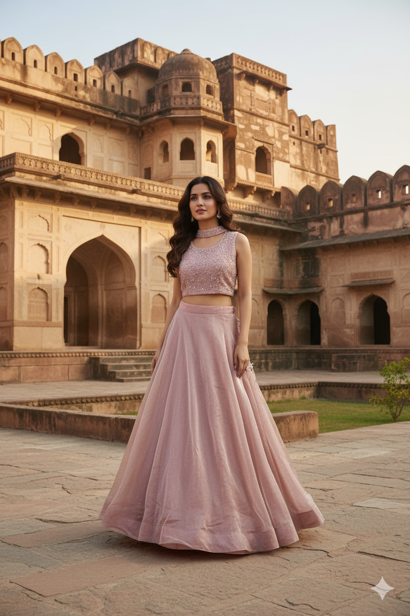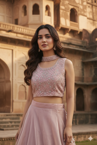 Dusty Pink Sequined Crop Top and Flared Lehenga Set
